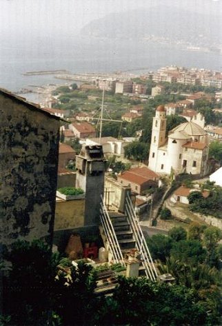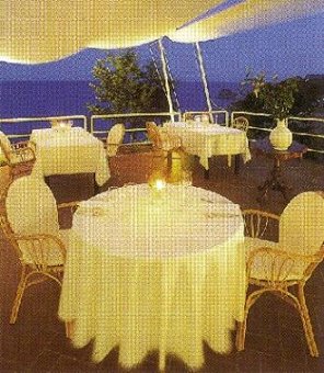 | なんだかんだつくろいで居るうちに、夕食の時間になりました。 着替えて、ちょっとお洒落して先ほどのレストランに下りていきました。 昼間とは又違って、蝋燭の灯るテラスもとても素敵です。 さすがに夜は席が一杯で、お洒落したイタリア人が沢山!! 私達が行くと、ここでも東洋人は珍しいのか一斉に他のお客さんに注目されてしまいました。 |