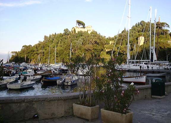眼下に綺麗な石畳の坂道と豪華クルーザーの帆の先が見える、ここが本日の目的地、ポルトフィーノです。