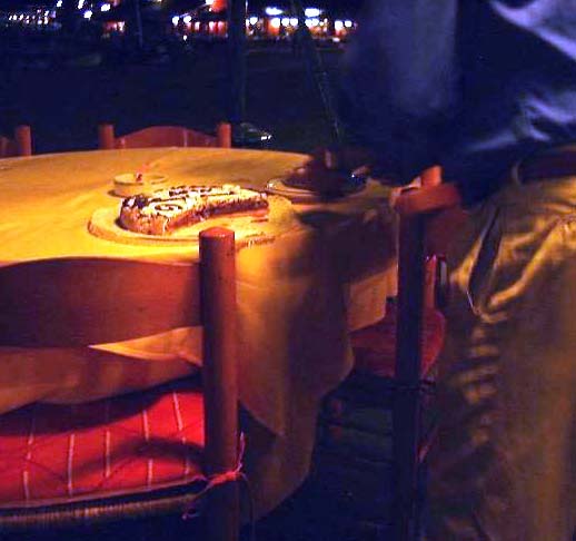 そしてデザートを食べ終わると、お腹が丁度いいくらい…どちらかというと7分目位でした。 メインは多少、少なめだったので、『1人1皿でも良かったかもしれないね…』なんて話していたら、なんとハプニングが起きました。 ここのレストランは週末ミラノやローマから車を飛ばしてやってくる常連の家族連れでいつもいっぱいらしいのですが、そんな常連さんたちの為に、ご主人がお誕生日やお祝いのケーキを特別に焼いてお祝いするのです。 で、この日も何組かお祝いされていて、微笑ましいなぁと眺めていたのですが…。 私達のすぐ横に、7人位の家族連れが座っていました。 で、そこのご主人が誕生日だったらしくて、子供達が可愛い声でお誕生日のお歌を歌いながらお店のご主人と店員さんがケーキを持ってきてお祝いしていました。 で、その後、ケーキは一旦下げられて、切り分けられて綺麗に盛りつけて運ばれるのですが、何故か私達のところにまで、運ばれてきたのです。 |