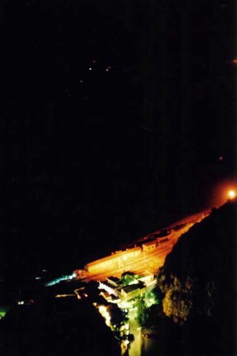 夜のPiazza 9 Aprilleから海を見下ろして・・・。明るいところはTaormina駅です。 |