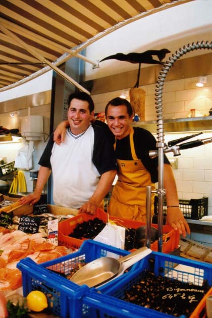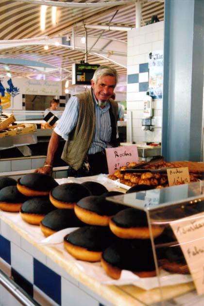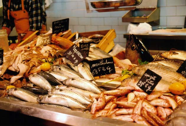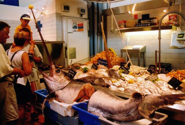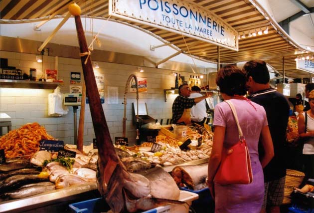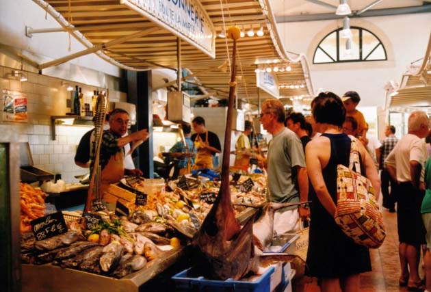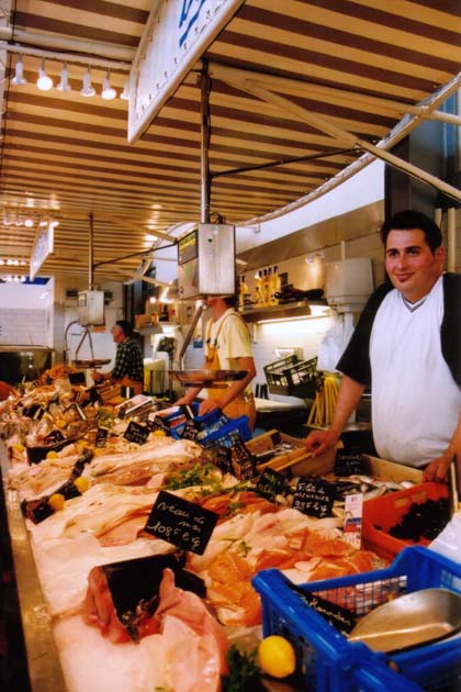 ここは常設市場で、お魚屋さんはもちろん、八百屋さん、お肉やさん、パンやさん、ワインやジャムなどを扱うお店など、色々あります。