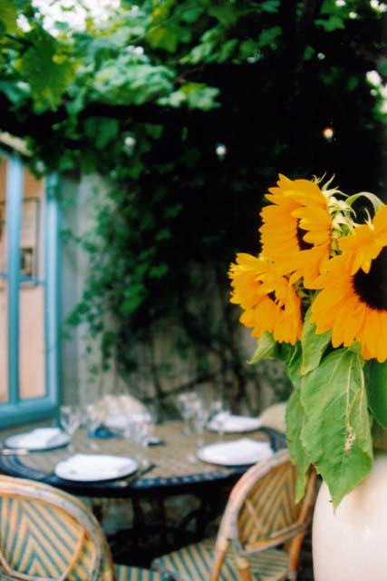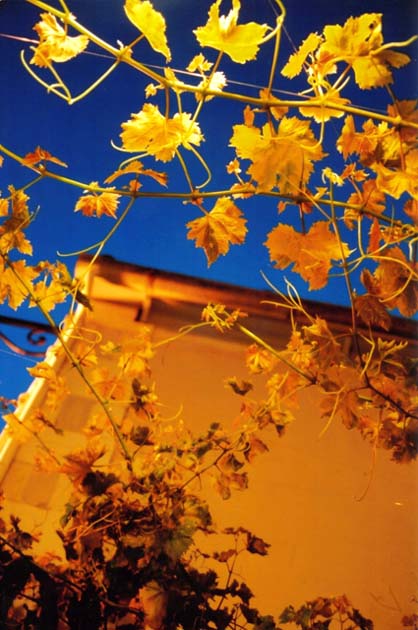 広いスペースに私達だけで、屋根は無く、見事な葡萄の緑の葉が屋根替わりです。