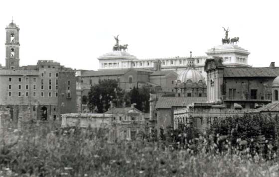 ![]() 画面の上中央にあるのが、ヴェネチア広場にある、Vittoriano(ヴィットリオ・エマヌエル二世記念堂)。 ウェディングケーキの愛称で親しまれるこの建物は、イタリア統一の英雄を称えてムッソリーニが建てさせた物。 |