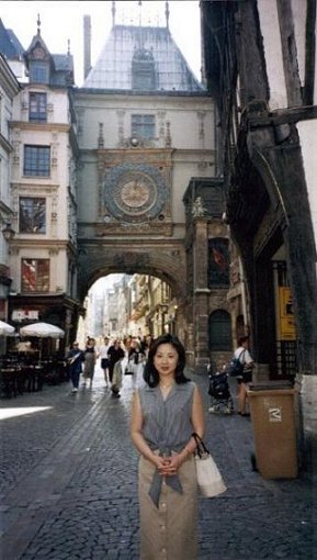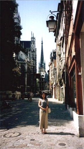 ![]() 大聖堂の裏側をバックに。 すぐ横にも、Eglise St-Maclou(サン・マークル教会)があります。 中央の尖塔が大聖堂で、その左がサン・マークル教会です。 |