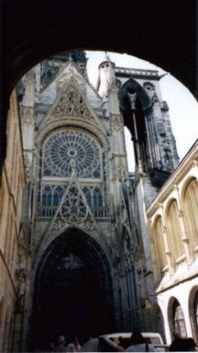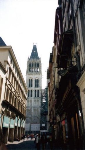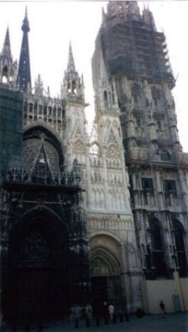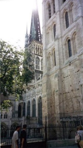 ![]() これがモネの絵で有名なルーアンの大聖堂、Cathedrale Notre-Dameです。 戦火により、真っ黒に煤けています。 正面から撮っているのですが、大きすぎて収まり切りません。 |