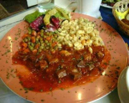 | 入ってすぐに、巨大なプロレスラーのようなおじさんが目に入り、一瞬ひるんでしまいましたが、このおじさん、見た目は怖いのですが、とてもやさしく親切で、私たちが又ドイツ語のメニューを英語で『これは何??』と何度も聞いても親切に教えてくださいました。 私は『又ザワークラウト!!』と心に決めていたので迷いませんでした。 先輩と彼女も結局ザワークラウトにし、だんなさまはドイツ風のシチュー『グラーシュ』にしました。 |
