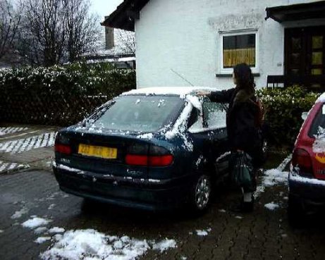 ![]() 先輩の愛車ルノーのラグーナちゃんも雪まみれ。 彼女が一生懸命雪をはらっています。 |