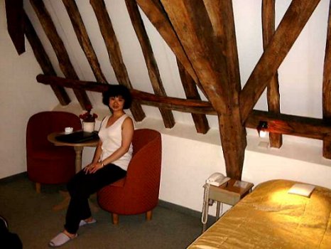 | ブルージュは元々フランドル地方の首都でした。 北海と水路で結ばれていた為に西ヨーロッパ随一の貿易港として繁栄を極めました。 経済的発展を基にブルージュは芸術の街としても開花します。 フランドル派の画家達の多くを送り出してきました。 しかし後に水路に土砂が溜まり貿易船の出入りが出来なくなると、死都と言われるまでに衰退してしまいました。 が、そのおかげで中世のままの美しい街並みが残され、現在はベルギー屈指の観光都市に上り詰めました。 ヨーロッパ中、世界中からこの愛らしい小さな静かな街にやってきます。 しかし、街の雰囲気がそうさせているのか、人々も時間も水路のようにゆっくりと流れていて、まさに避暑地という感じです。 特に私達が到着した日曜日はちょっと肌寒いくらいで、日曜日と言うこともあったのでしょう、人影もまばらでした。 取りあえず、ホテルに向かいました。 が、なかなか見つかりません。 パリで必ず道に表示があることに慣れてしまった私達にとって、たまにしか表示がないのはとても大変でした。 (パリはすべての道に名前があり、標識があるので地図さえあればなんとかなるんです) 迷いながらなんとかたどり着いた時は、すでにブルージュの街の半分を走っていたようで、車窓から見える風景に私は感動しているだけで、全然ナビしていませんでした。 通り過ぎる馬車を見るたびに、『あー!!!馬、うまぁ!!いいなー、乗りたい。』と子供のようになっていたので、だんなさまはあきれていたことでしょう。 (ちなみに、この『乗りたい』には、馬車に乗りたいという意味の他にも、乗馬そのままの乗りたいも含まれています!!) その日予約したホテルはなんと16世紀の建物で、現在保護建築物に指定されている古い建物です。 中は奇麗になっていて、あちらこちらに飾ってある調度品もアンティークの家具で本当に素敵でした。 私達はホテル全体の中では安い方の部屋でしたが、それでも充分の広さと窓からは中庭が見渡せて大満足でした。 昔の屋根裏部屋を改造したようで、天井が高くて黒光りする梁がむき出しになっていました。 何よりもホテルの人がとても感じ良くて、『フランスと違うなー』とすぐ比べてしまいました。 言葉はフランス語が通じて、しかも親切で感じがいいなんて、なんて便利なんだろうって。 |